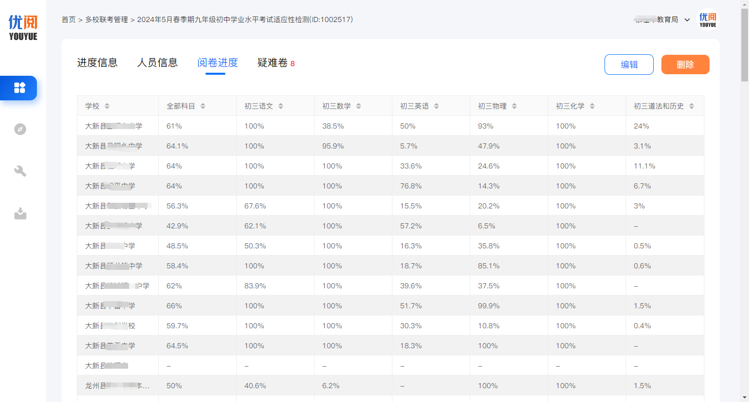 广西地区代理优阅在崇左市成功助力了初中学业水平考试。此次考试,参与学校多达100所,参考学生人数高达26360人,充分体现了崇左市教育事业的蓬勃发展。