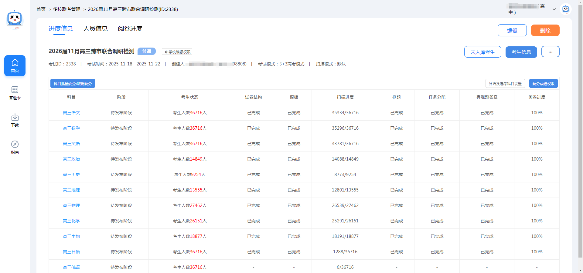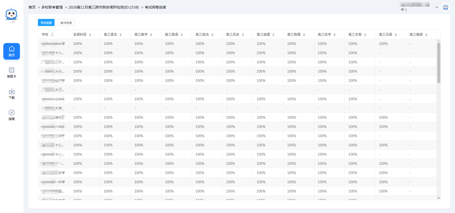 在刚刚圆满结束的2026届11月高三跨市联合调研检测中,桂林市引入爱探讨智能阅卷系统的代理服务商——小乐优阅,成功完成了对全市36716名高三考生答卷的评阅与分析。本次联考覆盖语文、数学、英语、政治、历史、地理、物理、化学、生物、日语、俄语等全部11个学科,标志着我市在教育测评服务的专业化与精准化方面迈上了新台阶。